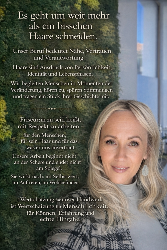Ein Besuch bei CoiffeurIela ist bewusst anders.Hier geht es nicht um Schnelligkeit oder Massenabfertigung, sondern um Qualität, Ruhe und echte Aufmerksamkeit. Ich nehme mir Zeit – für dich, deine Haare und deine Wünsche. Im Mittelpunkt stehen eine ehrliche Beratung, ein geschulter Blick und das Gespür für das, was wirklich zu dir passt. Gesundes, schönes Haar beginnt an der Kopfhaut. auf Wunsch arbeite ich mit professioneller Kopfhaut – und Haaranalyse sowie individuell abgestimmten Pflege – und Behandlungsplänen. Unterstützt durch moderne Technologien wie Vapomist und hochwertige, nachhaltige Produkte entsteht ein Ergebnis, das nicht nur gut aussieht, sondern sich auch langfristig gut anfühlt. CoiffeurIela steht für handwerkliche Präzision, laufende Weiterbildung und höchste Qualitätsansprüche – kombiniert mit einer warmen, persönlichen Atmosphäre. Ein Ort, an dem du ankommen, loslassen und dich gut aufgehoben fühlen darfst.